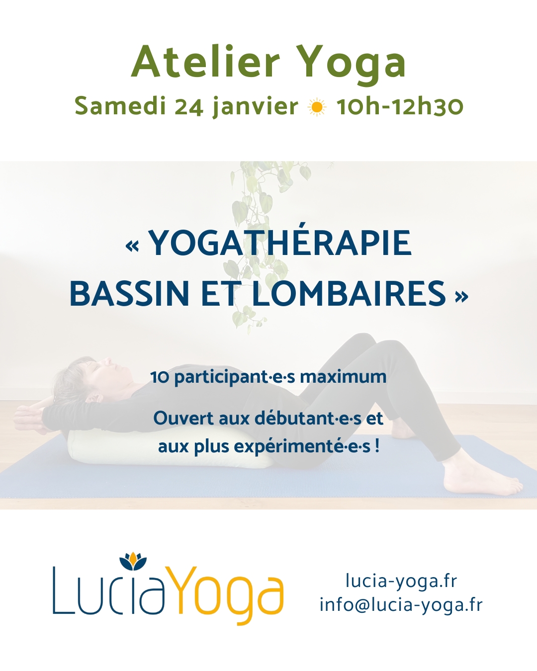 Le prochain atelier « Yogathérapie bassin et lombaires » se tiendra le samedi 24 janvier de 10h à 12h30.