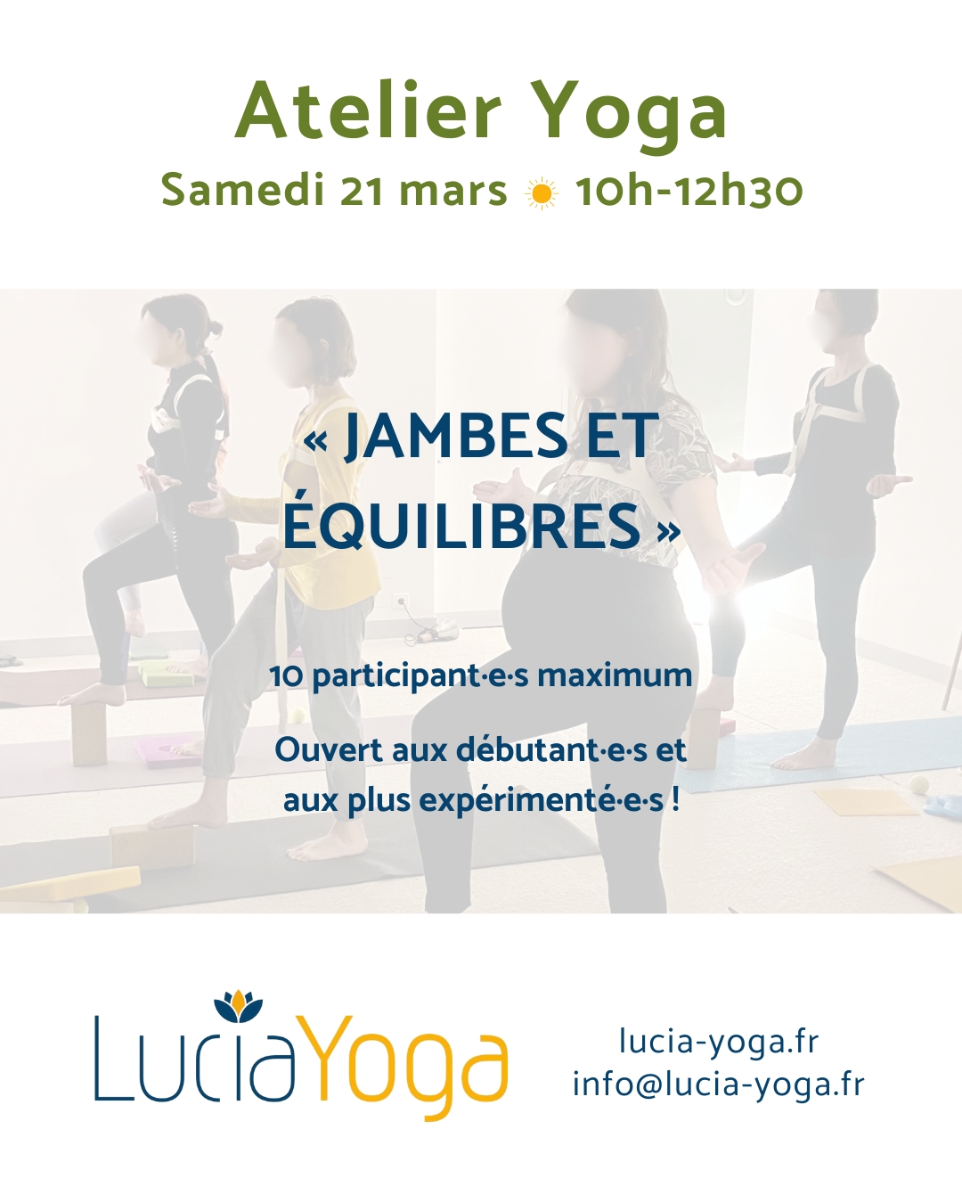 Les inscriptions sont ouvertes 2 mois avant chaque atelier et se font par email : info@lucia-yoga.fr